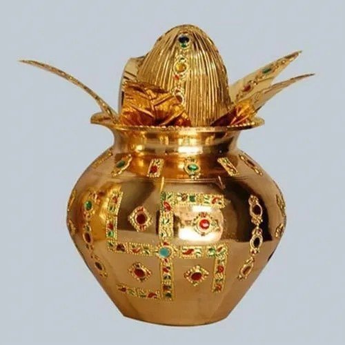 A metal pot (usually copper or brass) filled with water and topped with mango leaves and coconut. It represents life, purity, and the divine feminine energy (Shakti).